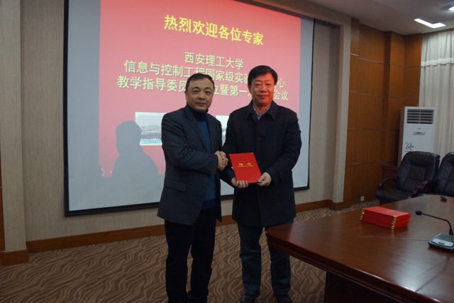 王德法宣读了信息与控制工程国家级实验教学示范中心教学指导委员会成员的聘任文件,刘军为专家颁发了聘书。西北工业大学潘泉教授、西安交通大学张爱民教授、清华大学王红教授、中国科学技术大学吴刚教授、中国矿业大学马小平教授、西安理工大学刘丁教授、刘涵教授受聘为委员,其中潘泉教授、张爱民教授分别担任主任委员和副主任委员。