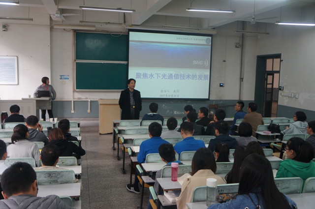 2017年10月20日上午11:00,敖珺教授在教六楼213教室做了题为“聚焦水下光通信技术的发展”的报告,柯熙政教授主持了本次报告会,学院相关研究方向的教师和研究生共100余人参加了此次报告会。会后,敖珺教授与在座师生就相关学术问题进行了交流,并且参观了光通信实验室。