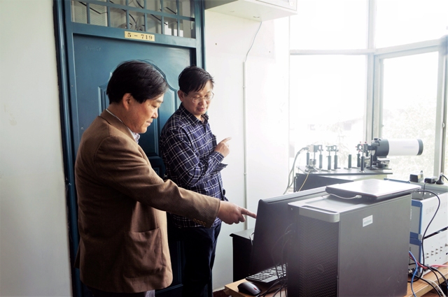 欧阳晓平院士(右一)听取柯熙政教授汇报相干光通信实验进展