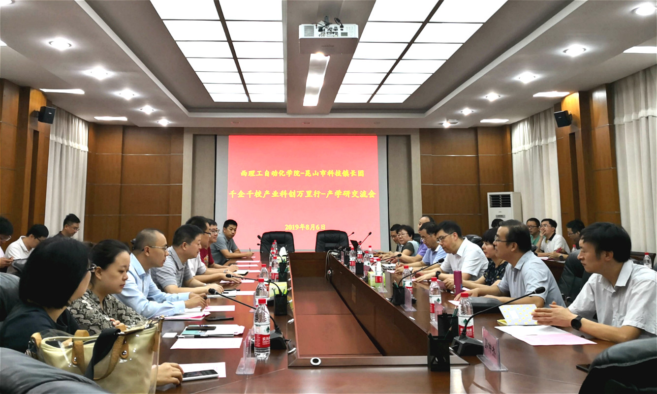 8月6日上午,学院与昆山市科技镇长团一行20人在教四楼101会议室召开产学研合作交流会。昆山市副市长肖立中、公共信用信息中心副主任汪宏韬、花桥经济发展局副局长刘雁桥、高新区科技局副局长吴凤兵,金沙城线路检测中心院长刘涵、副院长封先锋、电气系主任伍文俊、电气系支部书记宋卫章以及相关老师参加了交流会。交流会由封先锋主持。