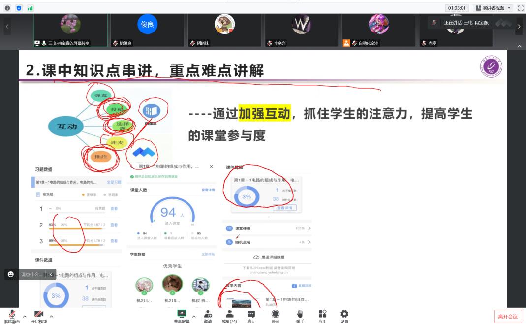 26日研讨会上,季瑞瑞副院长首先介绍了近期学院开展的关于保障线上教学质量的相关工作,希望广大教师深度参与此次专题教学法活动,充分交流,取长补短,不断提升自身教学水平,推动学院整体本科教学质量稳步提高。三电中心阎晓妹老师详细介绍了学生调查问卷的结果,强调同学们对线上教学集中的意见和建议包括“多互动,讲慢讲细,多答疑,课前发 PPT,希望课程能录制有回放”等。信控系和三电中心教师就线上教学的特点、经验及如何提升学生线上学习积极性进行了深入、细致的讨论;27日研讨会上,何力老师首先向参会老师介绍了学生调查问卷结果,针对线上教学的优点与突出问题,电子系和通信系老师踊跃发言,提出了很多有意义的做法,比如通过随机点名、让学生举手、加载手写笔、结合雨课堂、共享屏幕等各种各样的方式与学生进行良好的互动以及有效的沟通,最大限度地确保线上课程教学质量,与会教师还研讨了线上教学对今后教学改革的启示。